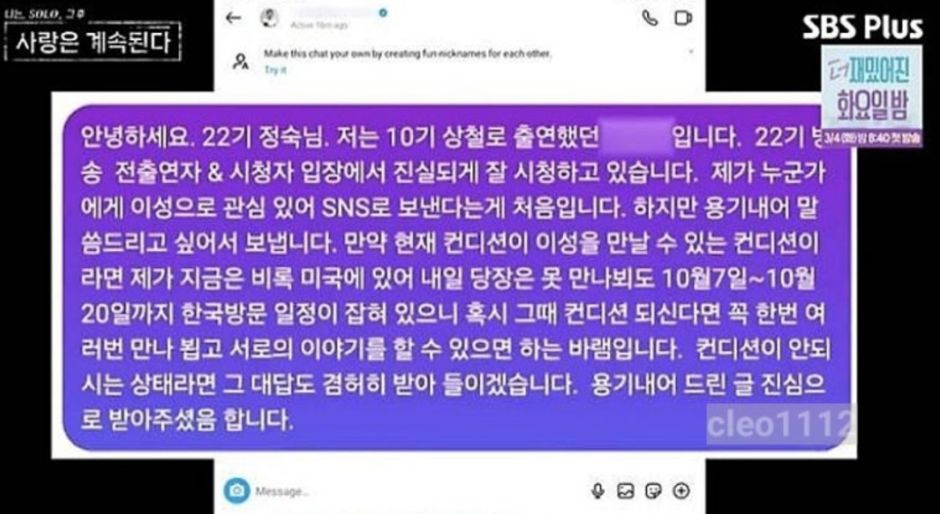 다른 기수로 출연한 두 사람은 전혀 접점이 없어 보였는데 도대체 어떻게 만나게 되었는지 궁금했습니다. 우선, 미국에 거주 중인 상철과 한국에 있는 정숙이 어떻게 만나고 이어졌는지부터 의문이었는데 상철님이 적극적으로 연락하여 만나게 되었다고 합니다. 나는 솔로 22기 방송을 보고 정숙님에게 반해서 인스타 DM을 보내었는데 정숙님이 읽지 았았으나 결국 15기 영철의 도움으로 24년 10월에 처음 만나게 되었다는 정보입니다.