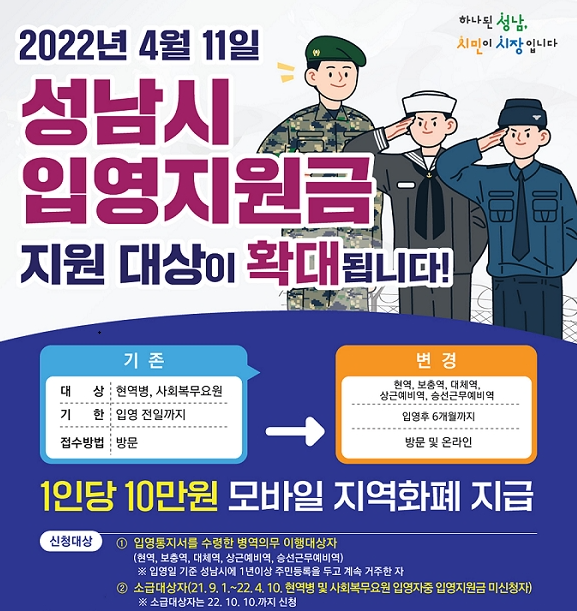 경기도 성남시는 현역병과 사회복무요원에게 지급하던 입영 지원금을 4월 11일부로 모든 병역의무 이행자로 확대했습니다. 입영 지원금 제도를 시행 중인 전국 15개 지자체 중 모든 병역의무 이행자에 지원금을 지급하는 곳은 성남시가 유일합니다. 지난해 9월 이 제도를 도입한 성남시는 모바일 지역화폐로 지급하고 있는데 아래를 통해 자세히 알아보겠습니다.