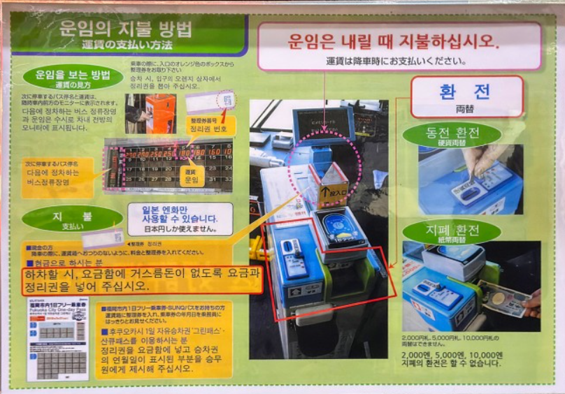 처음 버스를 이용할 때는 긴장되기도 하고 요금 내는 방법이 올바른지 몰랐는데 버스 기사분이 아주 친절했습니다. 종이랑 동전 현금을 기사분께 전달하니 내려도 된다고 표시하는 기사분도 계셨고, 한국말로 "전부 통에 넣어 주세요"라고 하시는 기사분도 계셨습니다. 일본 버스 현금으로 타는 법 아주 간단합니다.