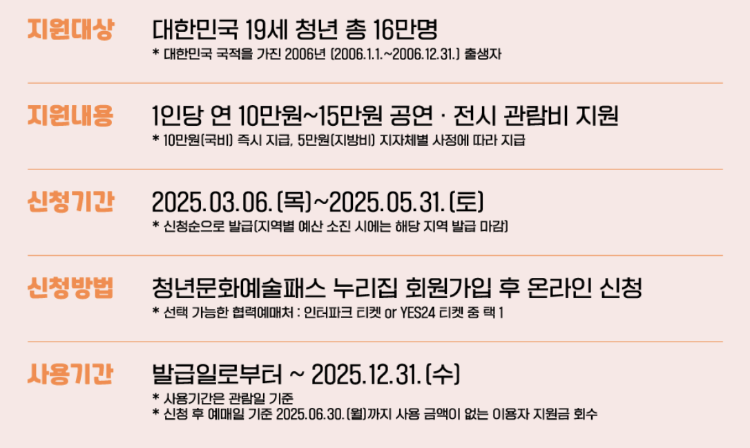 3. 청년문화예술패스는 연간 최대 15만 원 공연·전시 관람비를 지원하며, 각 지자체의 상황에 따라 지원 금액이 상이합니다.