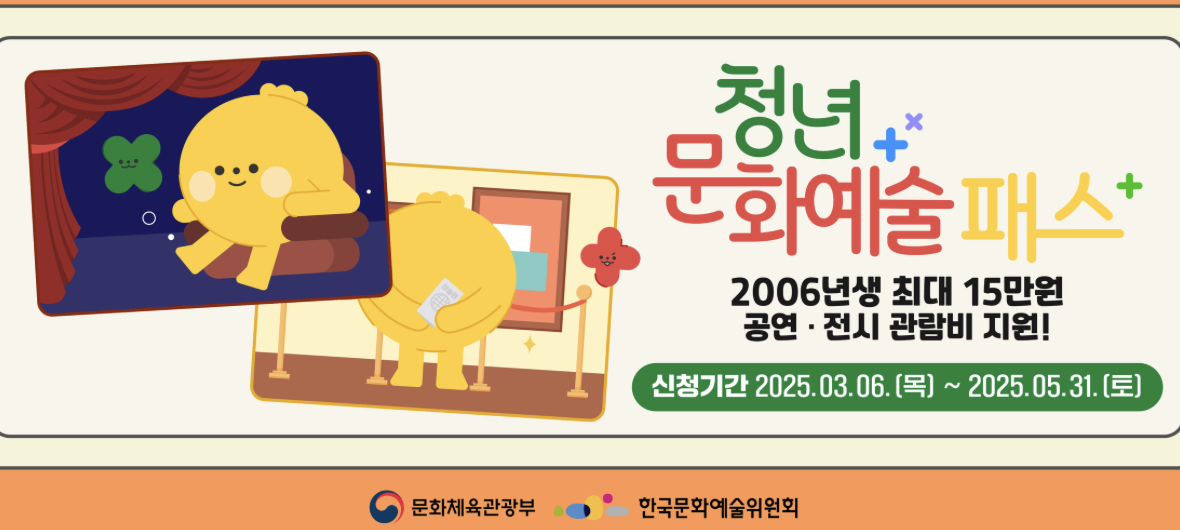 어려워지는 경기에 문화생활을 즐기기에도 부담스러운 요즘입니다. 특히 주머니 사정이 어려운 청년들은 더욱 그러한데 청년들이 문화생활을 영위할 수 있도록 좋은 정책이 시행됩니다. 청년문화예술패스란 청년들이 문화생활을 영유할 수 있도록 문화체육관광부가 최대 15만원을 지원하는 정책입니다. 지자체별로 지원 금액이 상이하여 10만 원 또는 15만 원의 금액을 지원합니다.