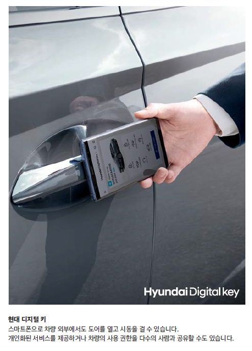 마지막으로 소개하고 싶은 특징은 바로 Convenience 측면 중 디지털 키입니다. 일상을 되돌아보면 집에서 밖으로 나갈때 한 번씩 자동차 키를 깜빡한 경우는 많은데 스마트폰을 놔두고 간 적은 없는 거 같습니다. 이럴 때 아주 유용한 기능. 스마트폰으로 자동차를 열 수 있습니다. 소나타 처음 나올 때 이 기능을 보고 얼마나 놀랐는지... 대박입니다!