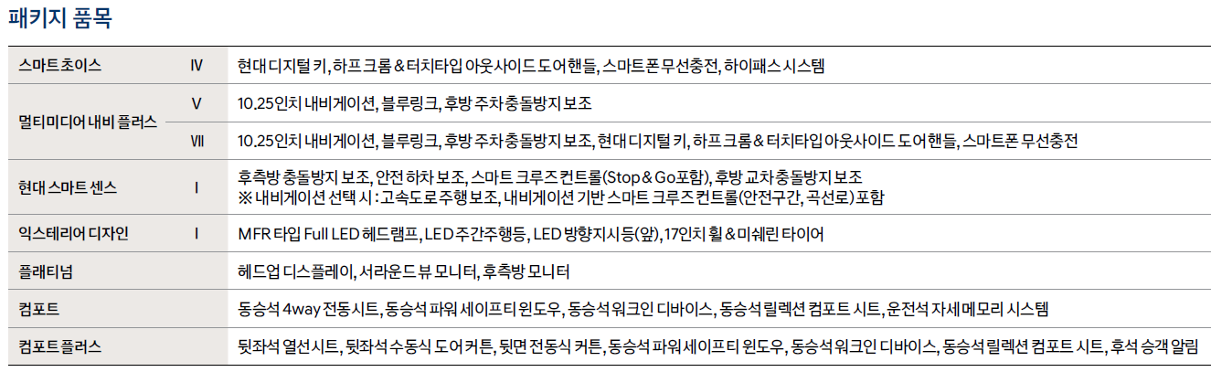 아쉬운 점은 파노라마 선루프, 솔라 루프, 빌트 인캠, 10.25인치 내비게이션, 통풍 시트, 뒷자리 열선, 운전대 열선의 선택이 불가능해서 트림 등급을 올려야지 선택이 가능합니다.