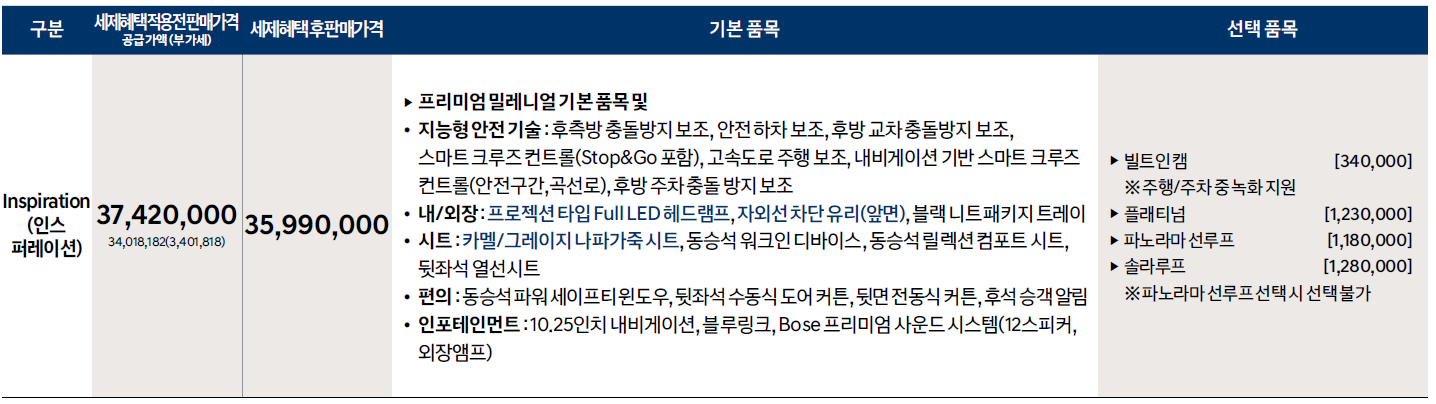 마지막 최고 등급인 인스퍼레이션은 프레미엄 밀레니얼 보다 269만 원이 비싸집니다. 하지만 기본으로 들어가는 장비를 보면 스마트 센스(74만원), 멀티미디어 내비 플러스 (106만원), 보스 사운드 시스템(61만원), 컴포트 플러스(57만원)을 합치면 298만원이되는데 한 단계 윗 트림을 골랐는데도 불구하고 특이하게 29만원이 다운되는 효과가 생깁니다. 거기다가 나파 가죽시트, 윈드 실드가 자외선 차단 글라스로 상승되니 프리미엄 밀레니얼 등급의 가성비가 안 좋게 느껴집니다.