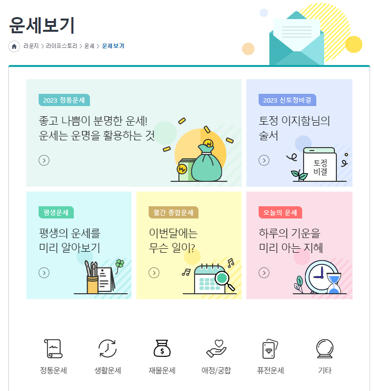 저의 주계좌 은행이 농협이라 농협사이트에 자주 들어가 보았는데요. 정통운세, 생활운세, 재물운세, 애정궁합, 퓨전운세 등 무료로 보실 수 있는 운세가 있습니다. 별자리, 퓨전운세도 무료로 볼 수 있는 농협사이트에서 다양한 운세를 확인하실 수 있습니다. 23년 운세는 농협 무료 운세 보기에서 확인하는 거 어떠세요?