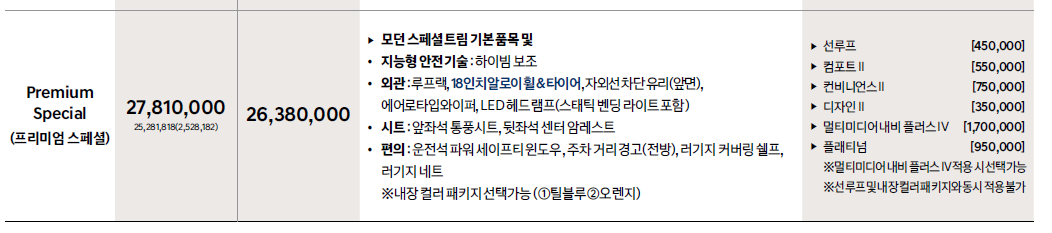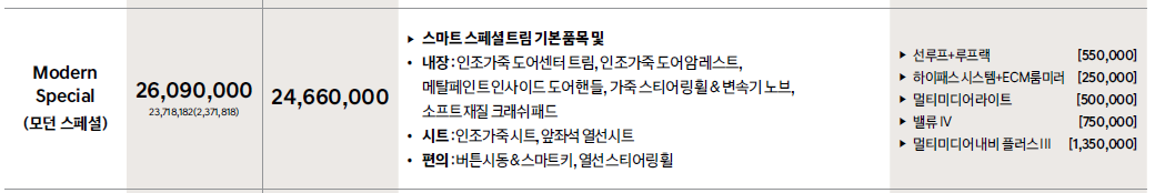 개인적으로 모던 스페셜 등급에 멀티미디어 내비 플러스3, 하이패스 시스템 + ECM 룸미러, 선루프+루프랙을 추가하여서 26,810,000에 출고하는 걸 추천드리고 싶습니다. 벨류4를 넣는 것보다 16인치 휠로 가성비를 누리는게 더 좋지 않을 까 생각합니다.