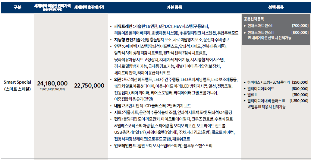 코나 하이브리드는 스마트 스페셜, 모던 스페셜, 프리미엄 스페셜 3가지 등급으로 나뉘어 있습니다. 그럼 바로 살펴보겠습니다.