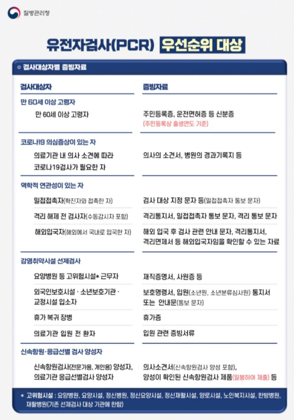 만 60세 이상 고령자, 코로나 19 의심 증상이 있는 자, 감염 취약시설 선제 검사자, 신속항원/응급 선별검사 양성자로 구분됩니다. 하지만 정부 방침이 계속 변동되고 있으니 예의 주시해야 합니다. 아래 표를 참고해주세요!