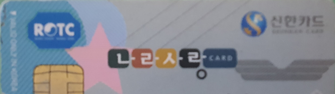 * 2학년 겨울방학이 되면 학군사관 후보생이 되기 위하여, 교육생 신분으로 기초 군사훈련이라는 것을 가게 됩니다. 제 기억에는 기초 군사훈련 때 나라사랑카드를 발급받기 위해 신청서를 작성한 것 같습니다. 아래처럼 ROTC만의 나라사랑 카드를 발급받게 되고 이 카드 계좌로 후보생들이 받을 수 있는 돈이 입금됩니다.